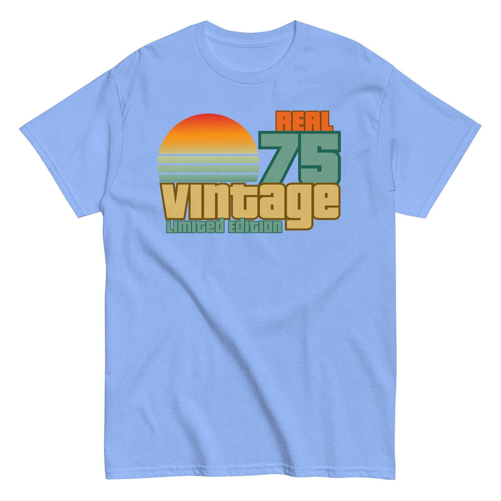 This t-shirt is all about classic vintage appeal. The sunset-style print gives it a nostalgic 70s feel, making it an ideal choice for men who love a bit of old-school charm. The “Real 75 Vintage Limited Edition” text adds a fun and stylish touch, ensuring that anyone wearing it stands out from the crowd. Whether they enjoy retro fashion, classic cars, or simply want to celebrate their birth year in a unique way, this design is the perfect choice.