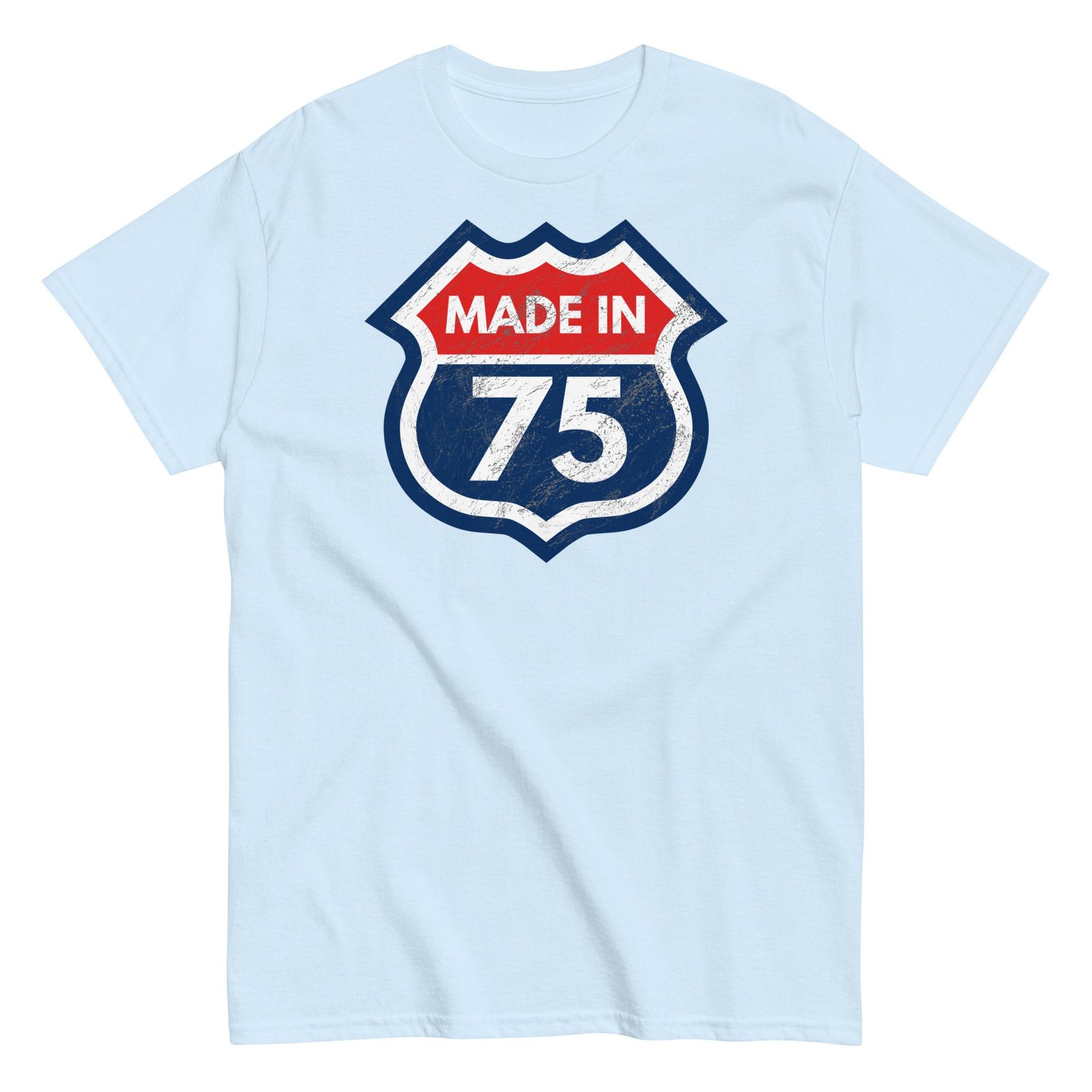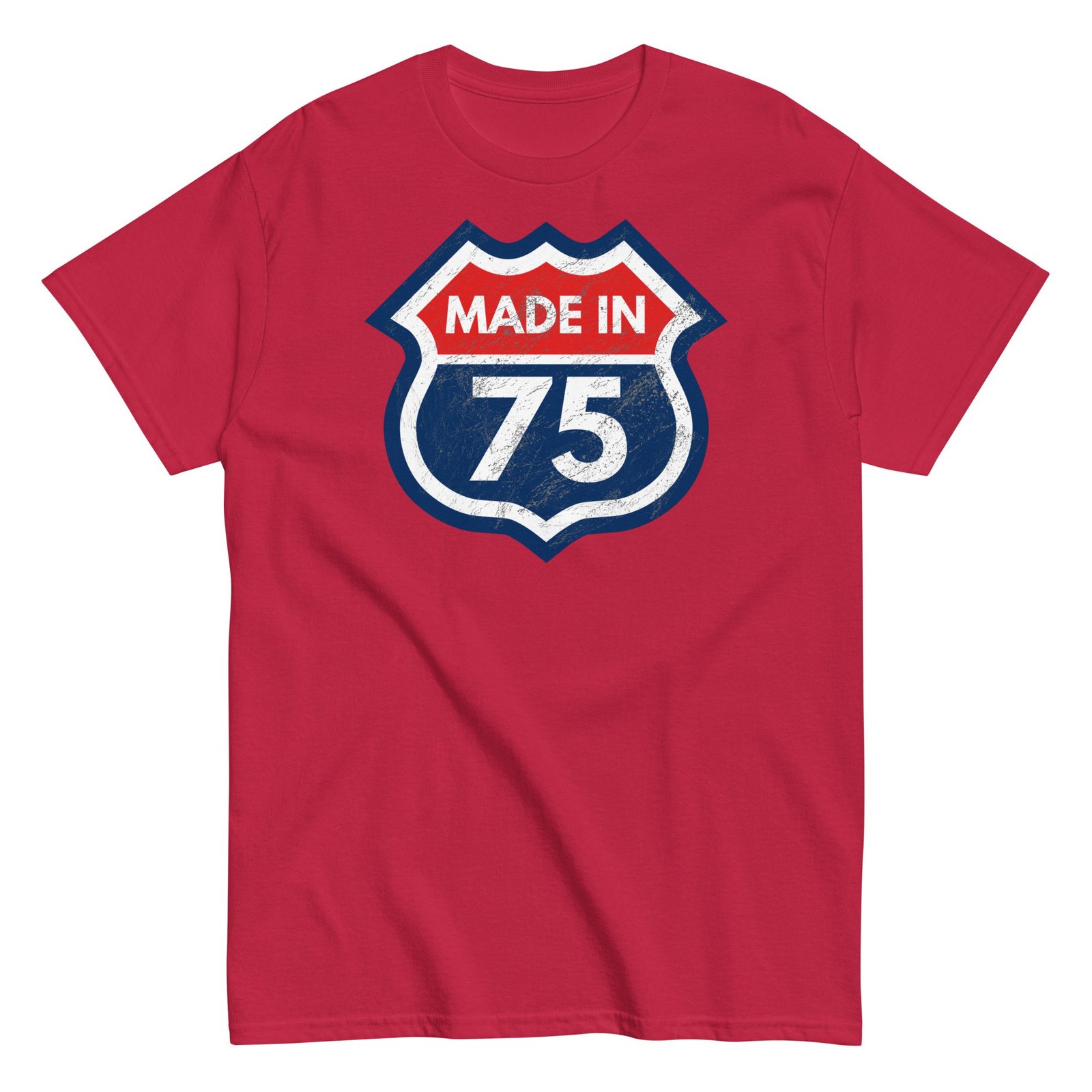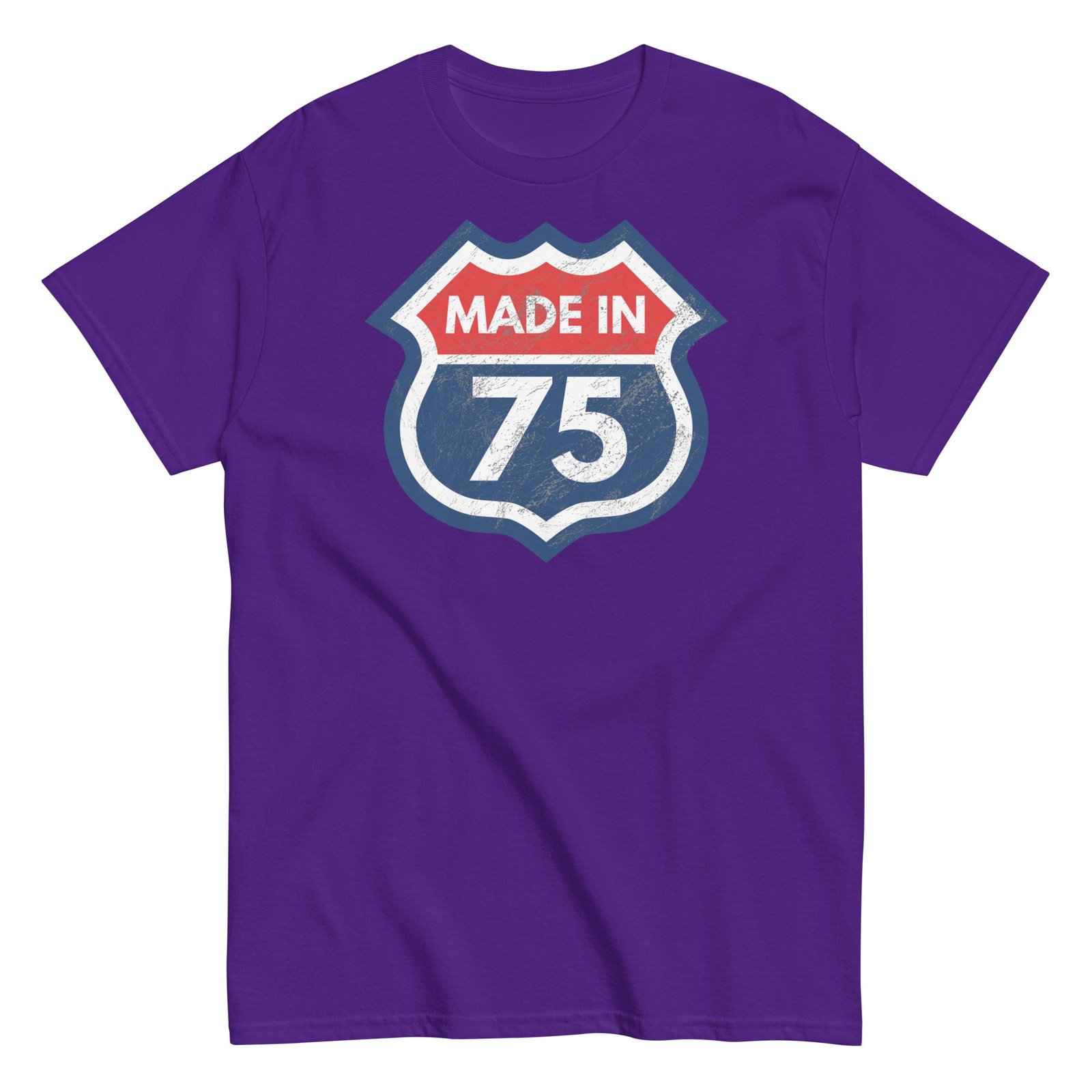 This t-shirt features a Route 66-inspired design, incorporating the “Made in 75” text to highlight a milestone birth year. The road sign theme gives it an old-school yet timeless appeal, perfect for men who appreciate classic style, road trips, or retro fashion. It’s an easy way to add character to any casual wardrobe while celebrating an iconic era.