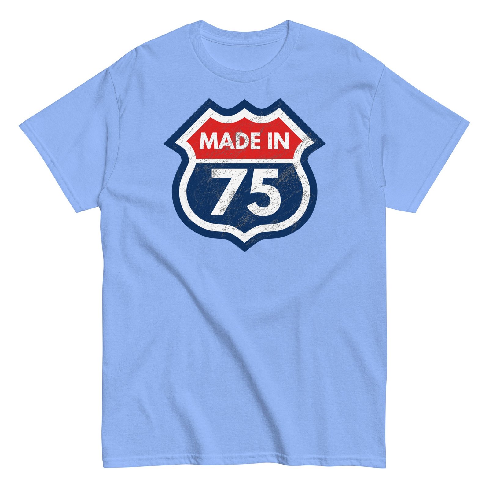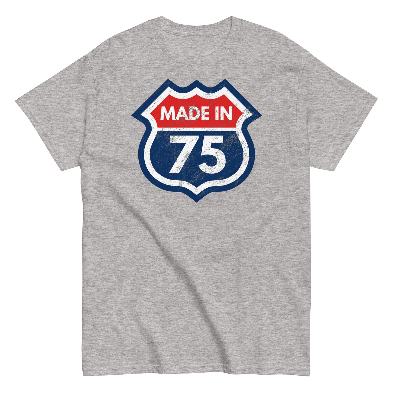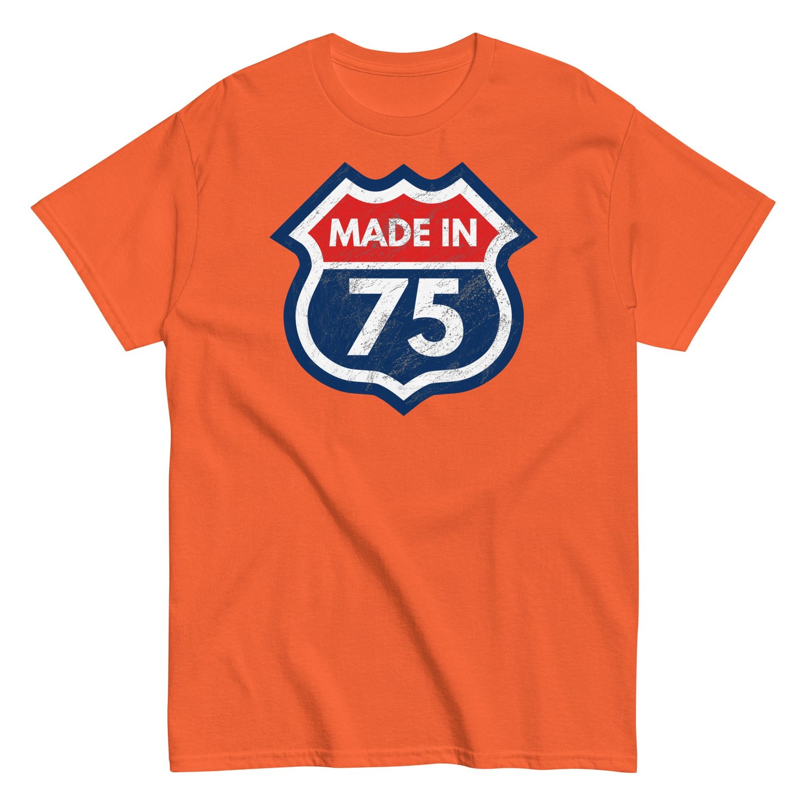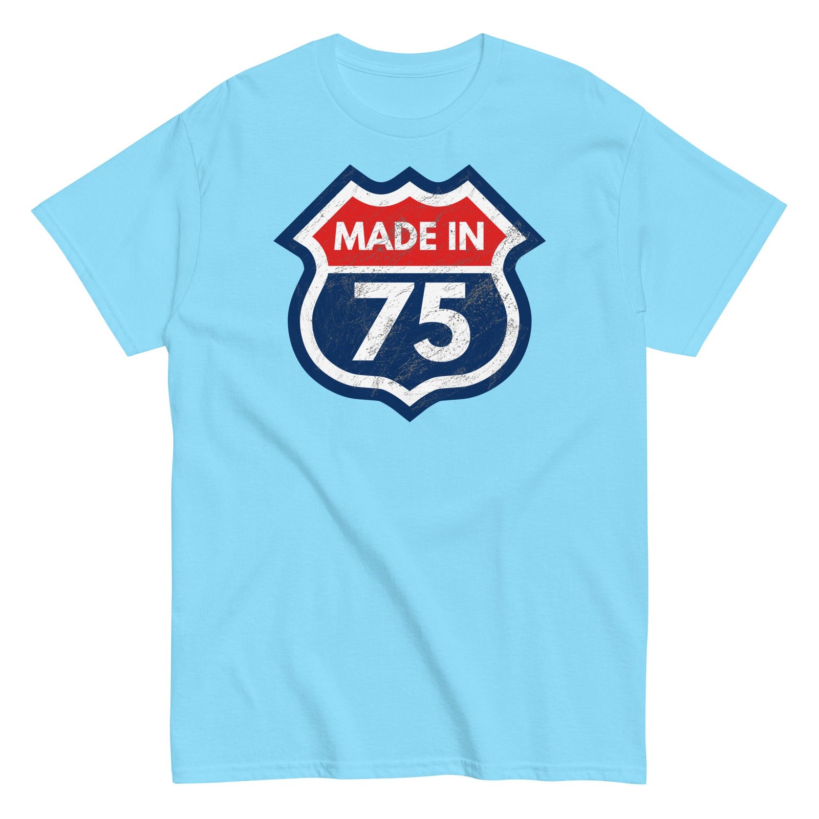 This t-shirt features a Route 66-inspired design, incorporating the “Made in 75” text to highlight a milestone birth year. The road sign theme gives it an old-school yet timeless appeal, perfect for men who appreciate classic style, road trips, or retro fashion. It’s an easy way to add character to any casual wardrobe while celebrating an iconic era.