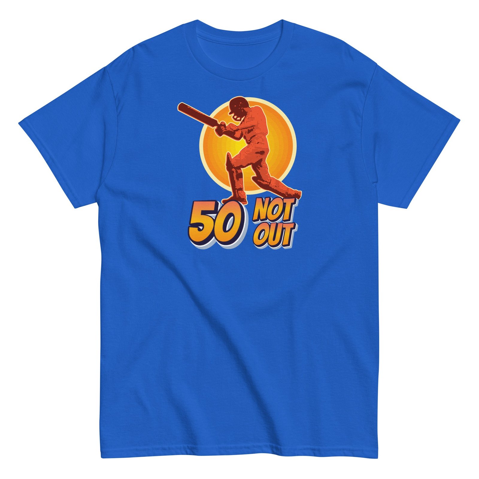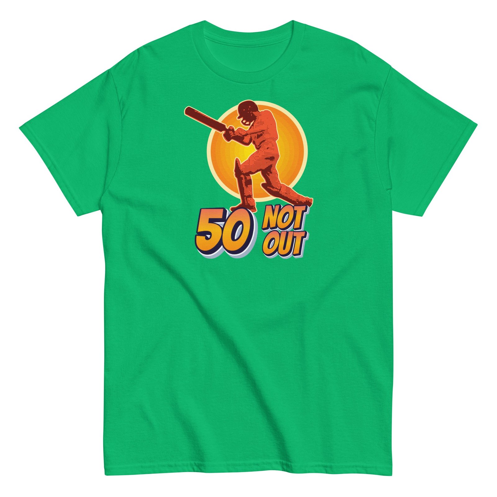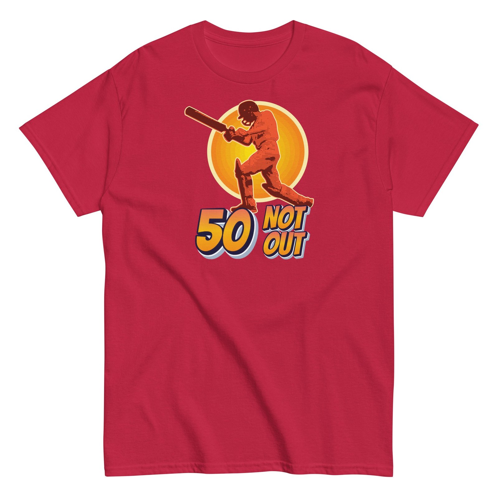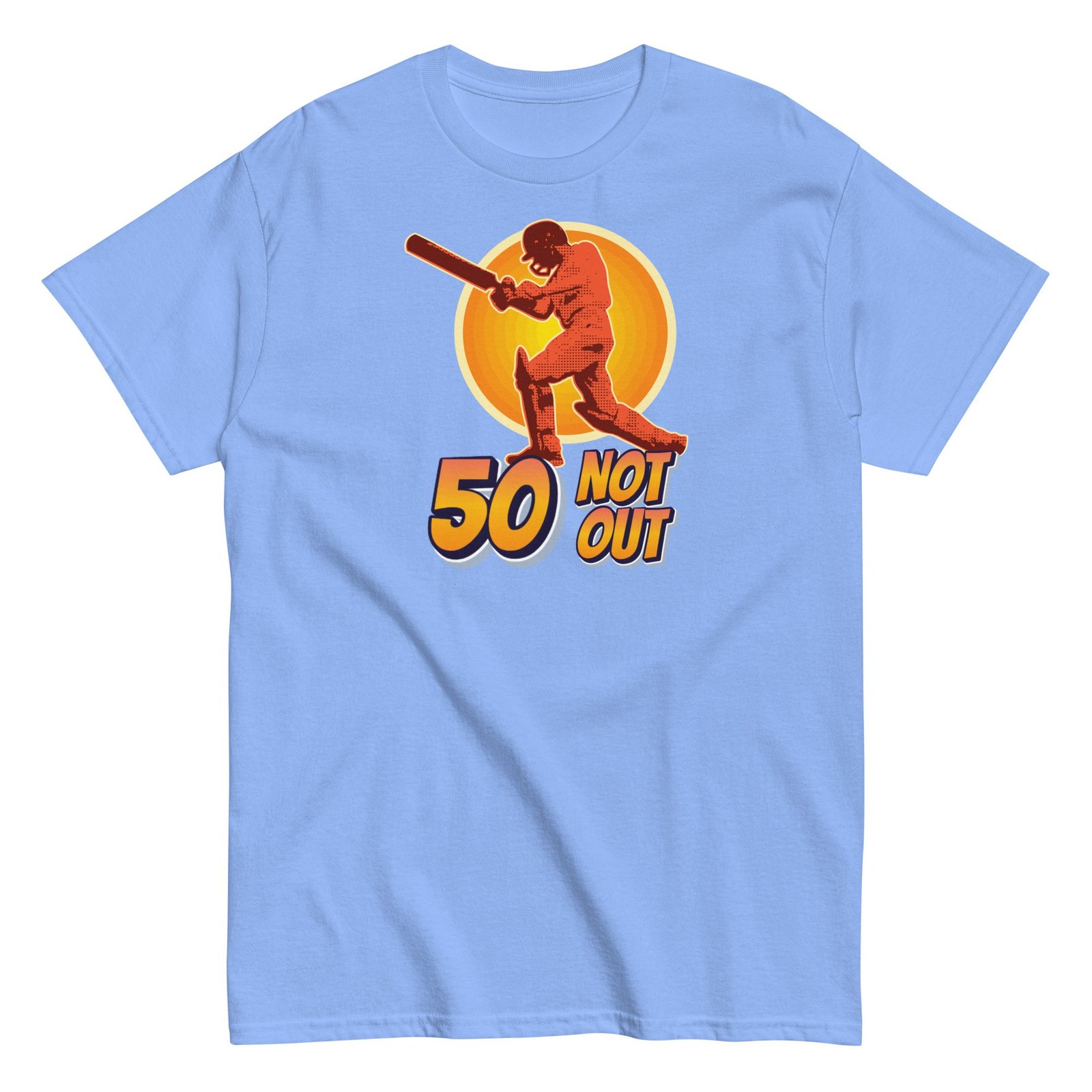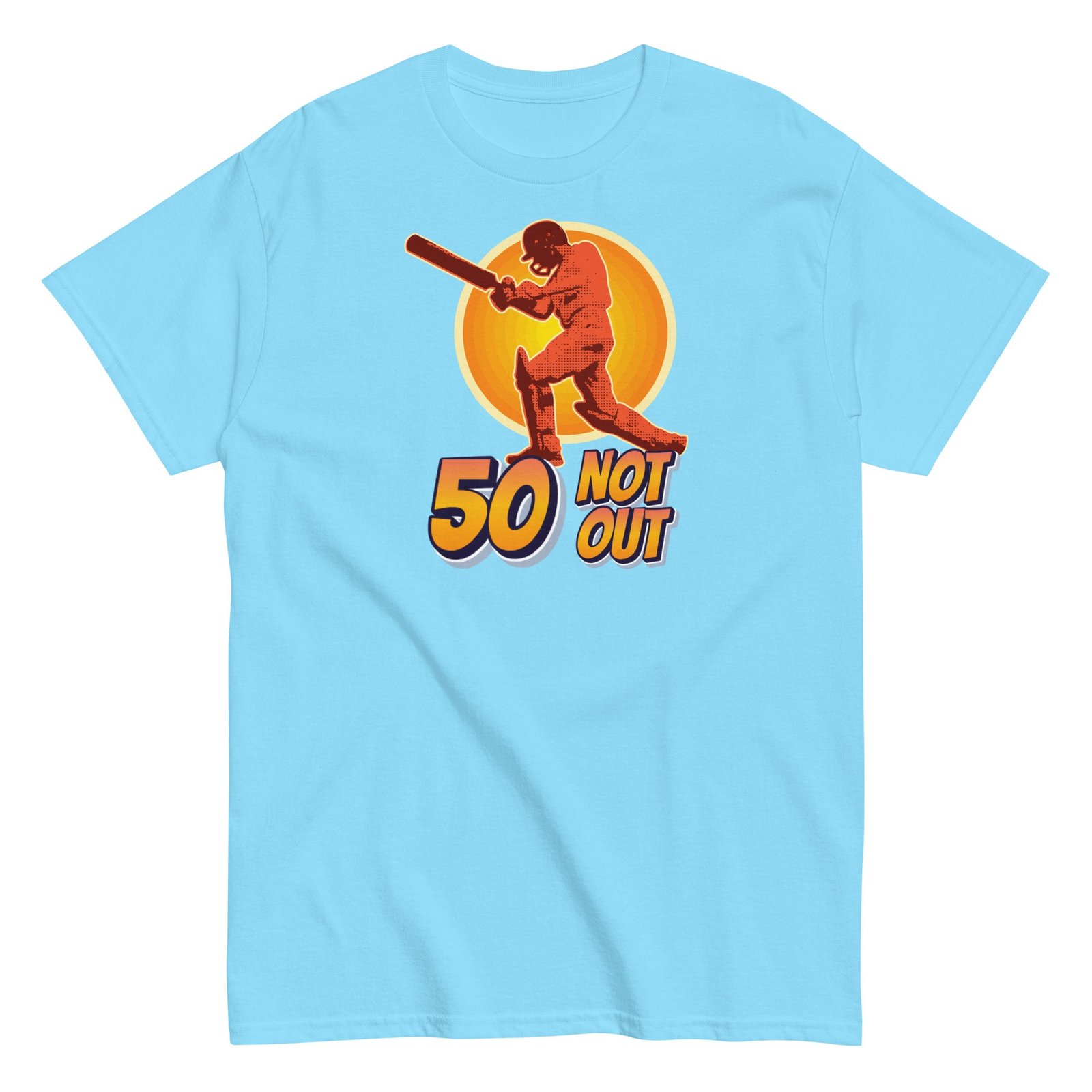 - “50 Not OUT” design with cricket batsman graphic – ideal for celebrating cricket-loving milestone birthdays.