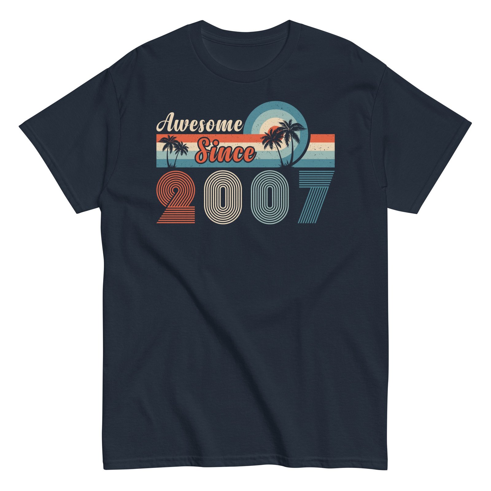 Bold retro design – “Awesome Since 2007” with sunset, palm trees and vintage flair.