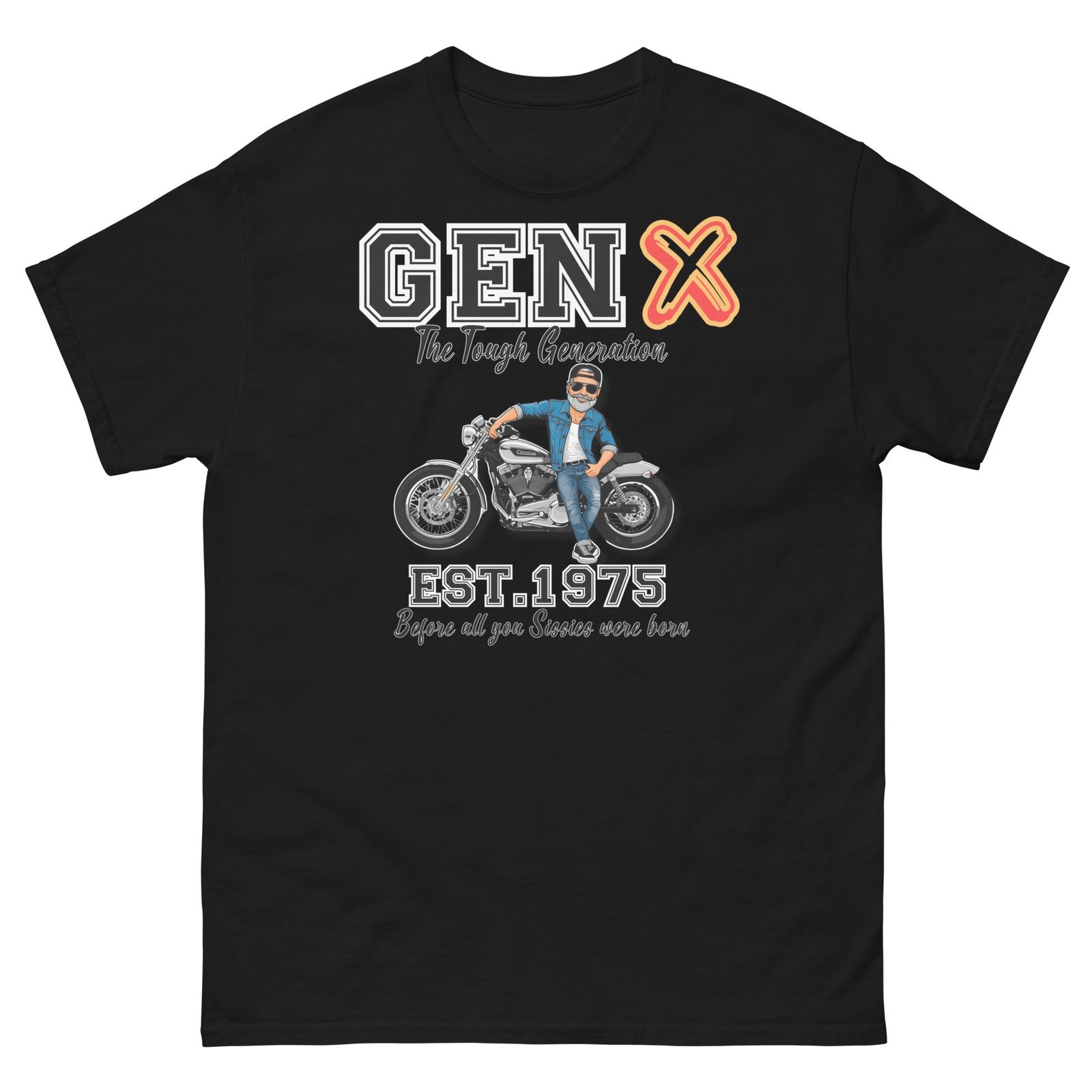 Looking for the perfect T-shirt Birthday Gift for 1975 Birth Year? This bold and humorous t-shirt is a brilliant choice for any man born in 1975 who takes pride in being part of Generation X. Designed with attitude and style, it features the statement “GEN X – The Tough Generation – Est. 1975 – Before All You Sissies Were Born”, alongside an image of a grey-bearded biker standing by his motorcycle. If you want a fun and affordable birthday gift for a dad, husband, grandad, uncle, or mate, this t-shirt is guaranteed to impress.