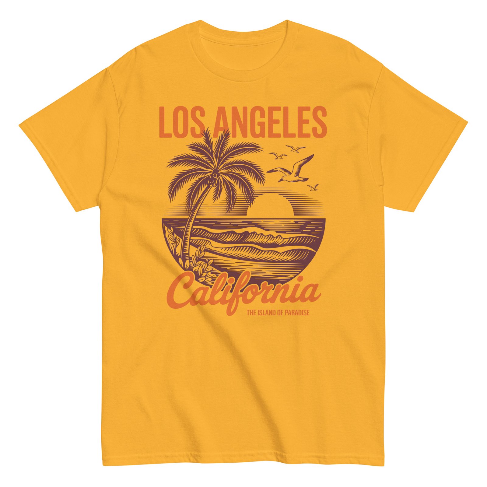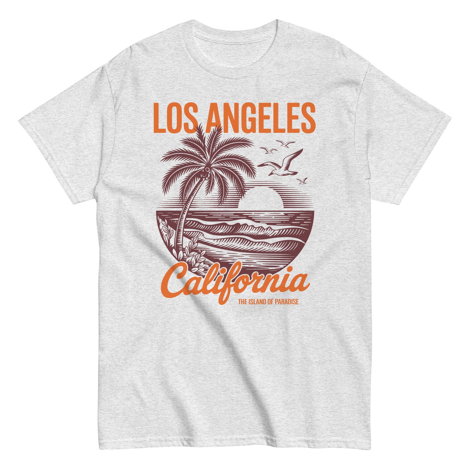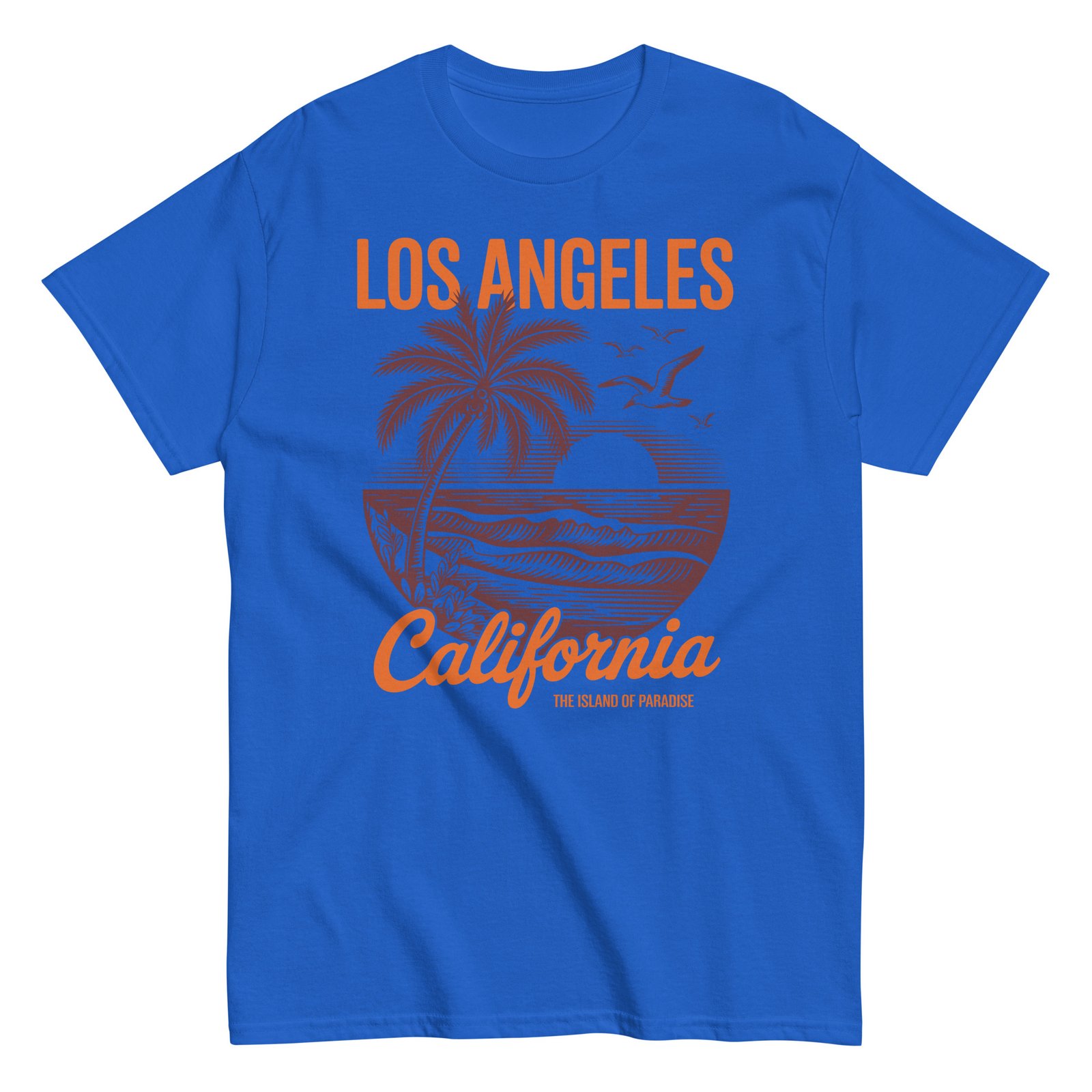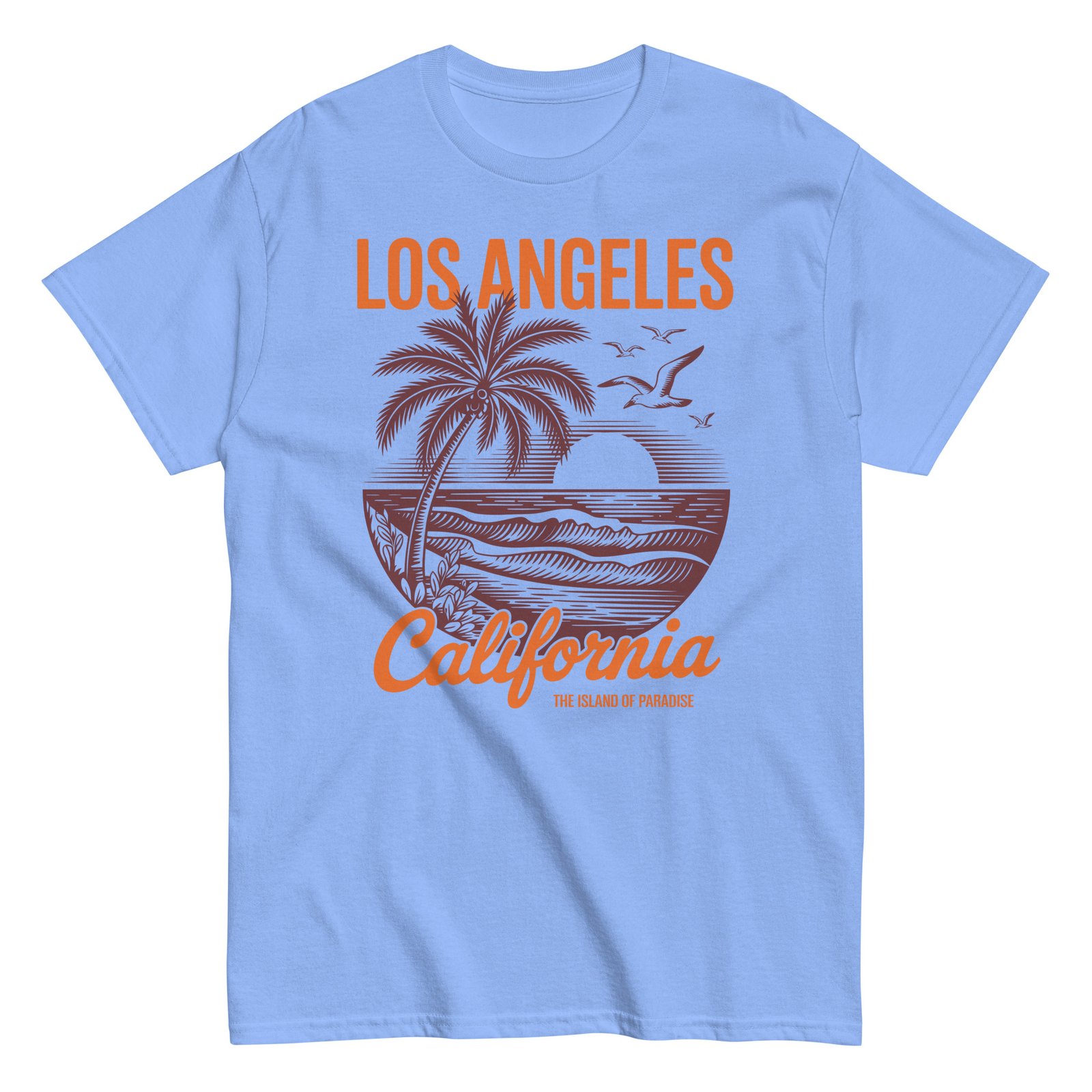 Our surf t-shirts oozes relaxed coastal cool with its nostalgic design. The artwork features a bold sun setting behind rolling waves, flanked by tall palms and soaring seagulls, all framed in an eye-catching circular motif. The words “Los Angeles California” pop in contrasting orange and deep brown, adding a warm retro touch that perfectly complements the soft Carolina blue fabric. It’s not just a T-shirt—it’s a ticket to paradise.