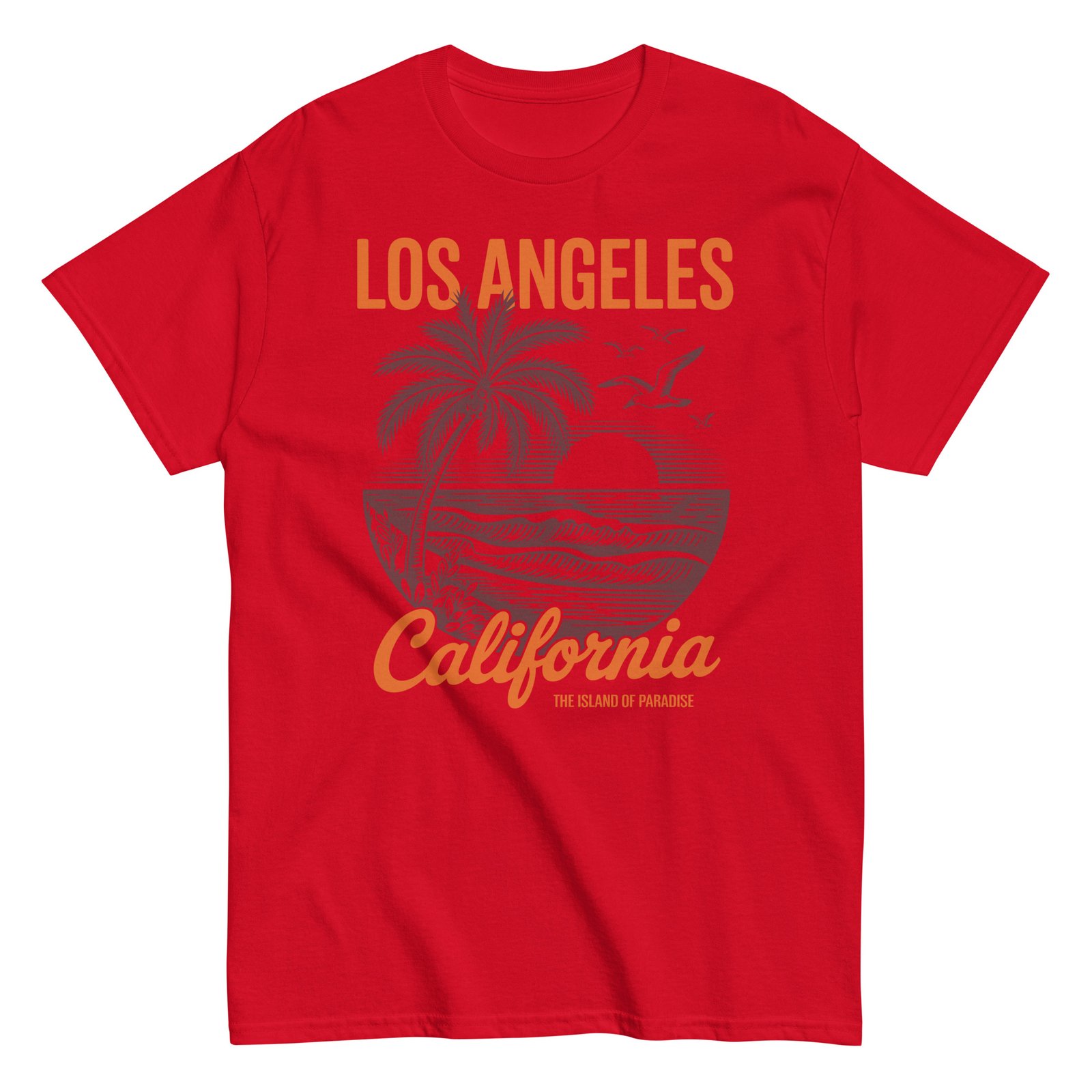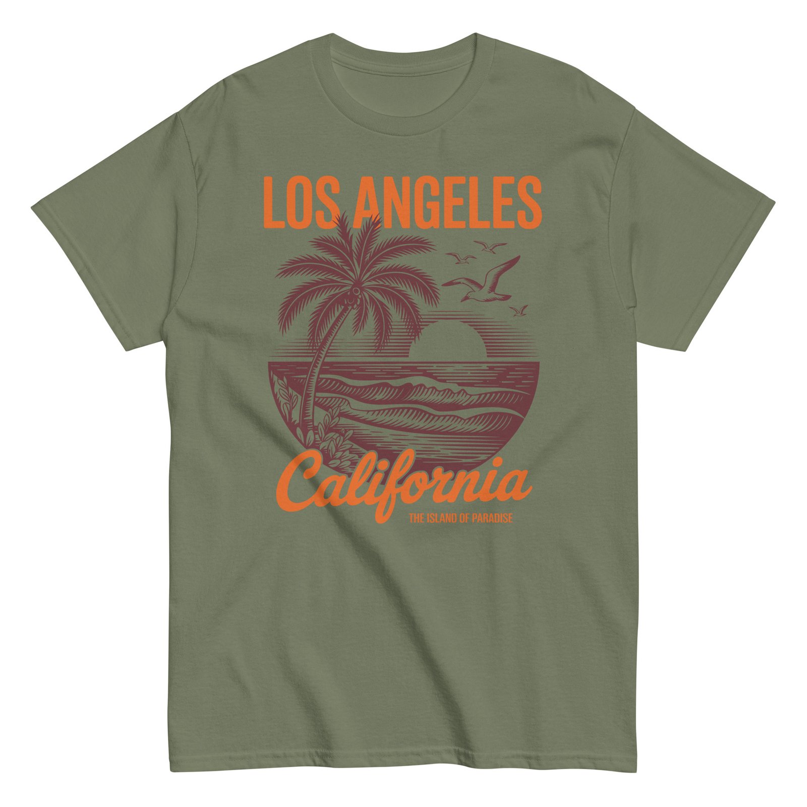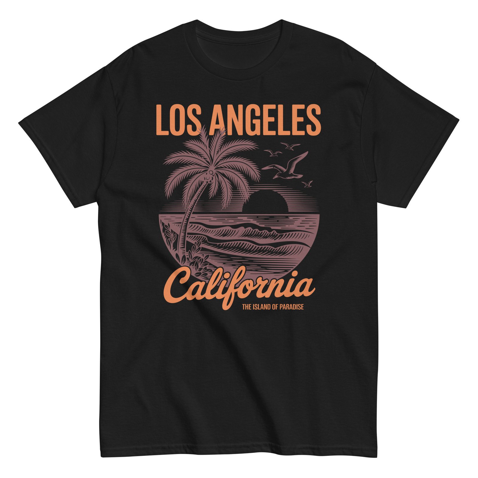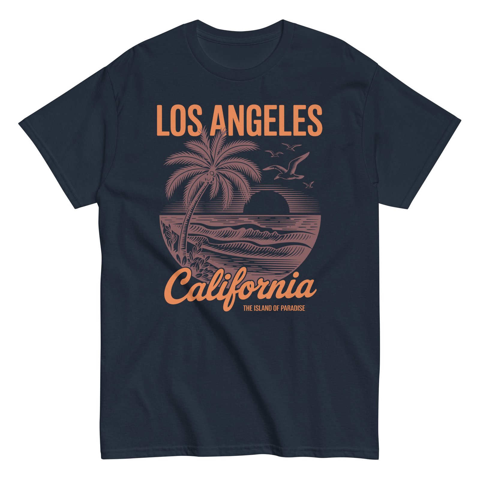 Our surf t-shirts oozes relaxed coastal cool with its nostalgic design. The artwork features a bold sun setting behind rolling waves, flanked by tall palms and soaring seagulls, all framed in an eye-catching circular motif. The words “Los Angeles California” pop in contrasting orange and deep brown, adding a warm retro touch that perfectly complements the soft Carolina blue fabric. It’s not just a T-shirt—it’s a ticket to paradise.