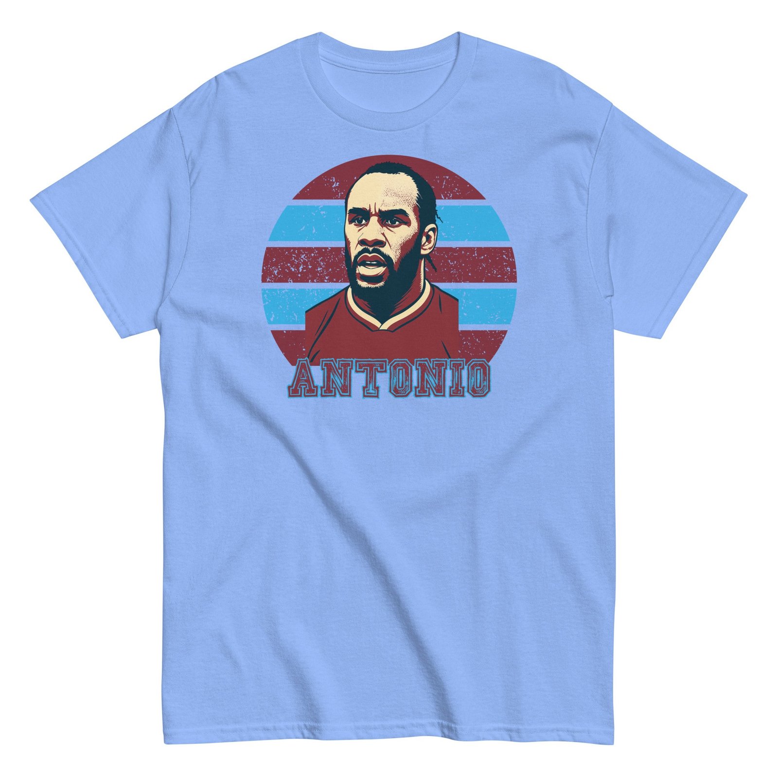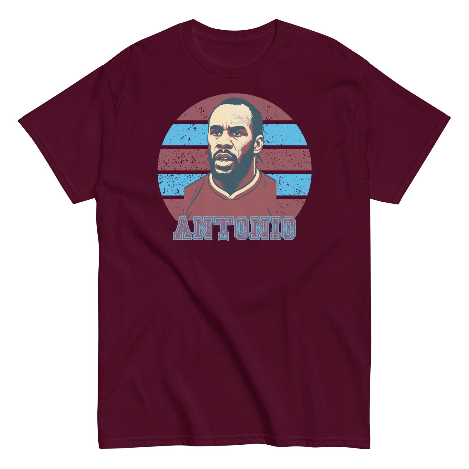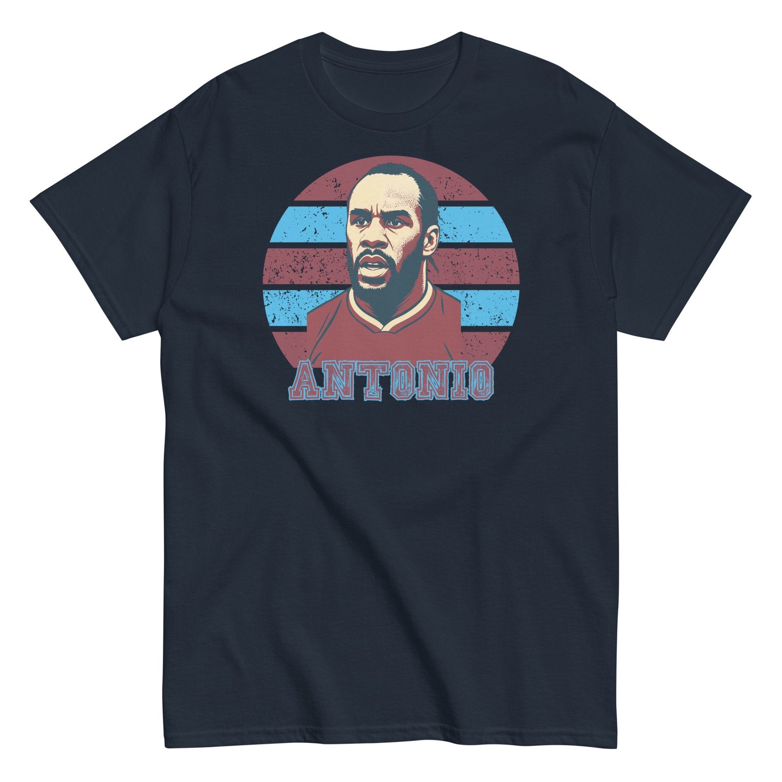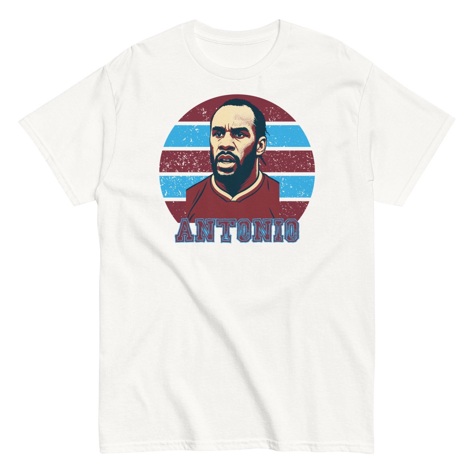 The artwork takes centre stage with a retro-inspired illustration of Michail Antonio – complete with his determined game face – overlaid on a classic background in claret and blue. Underneath sits his name in gritty, bold lettering that shouts pride without saying a word. This isn’t just another football tee; it’s a wearable tribute to one of the club’s modern-day icons.