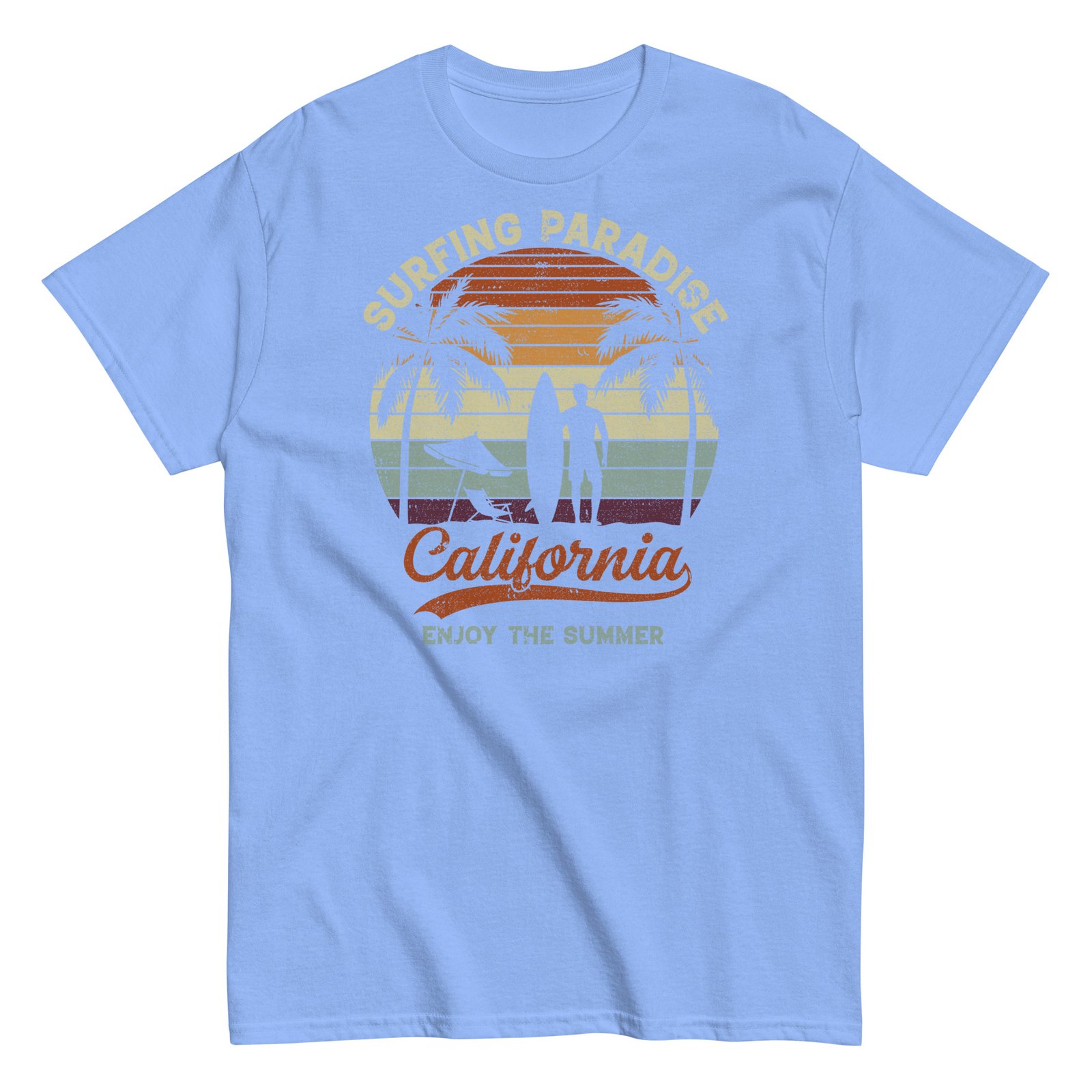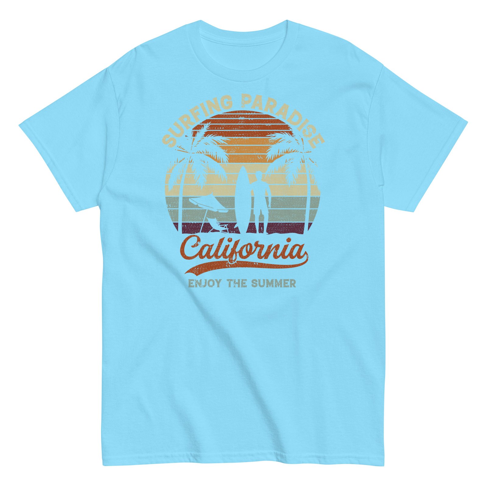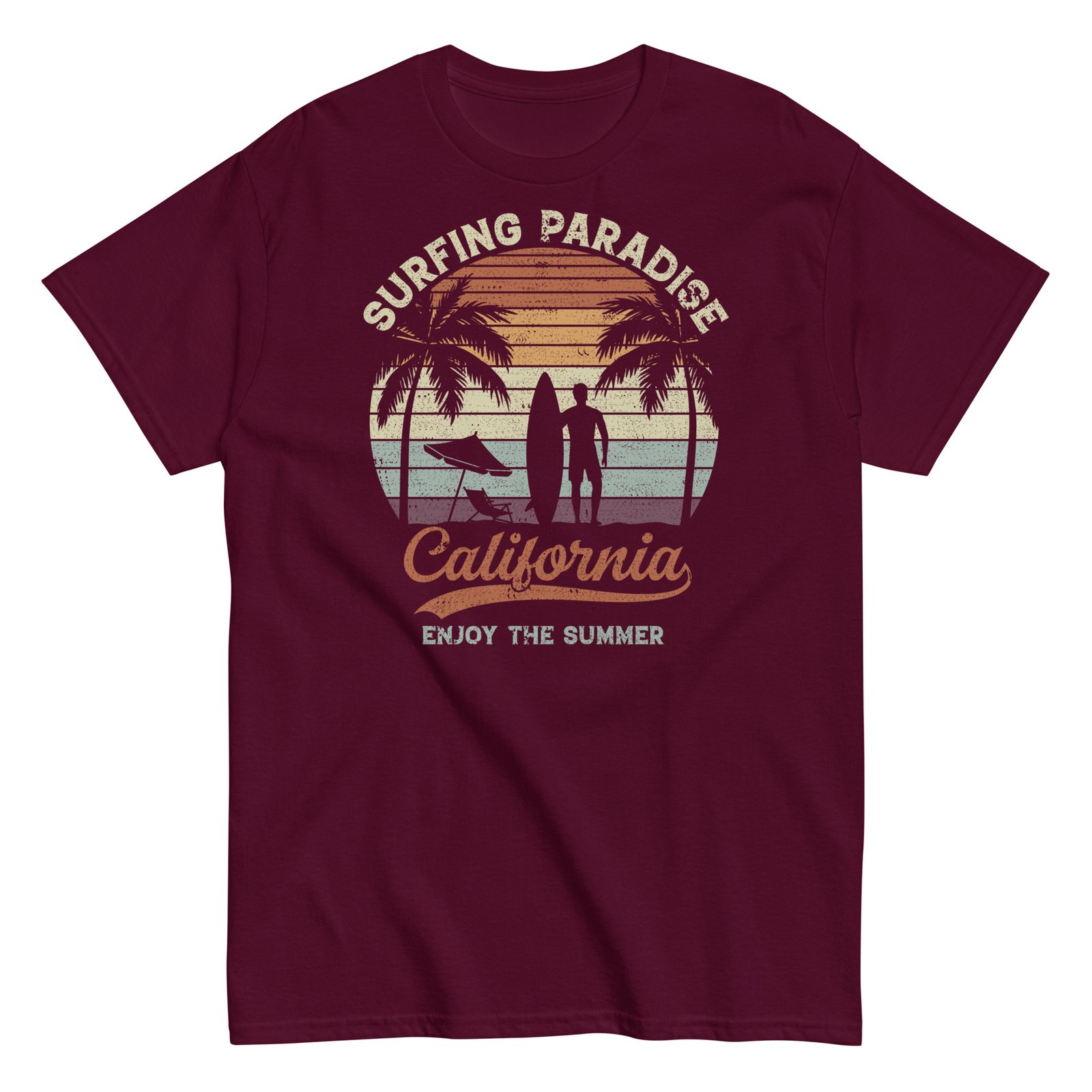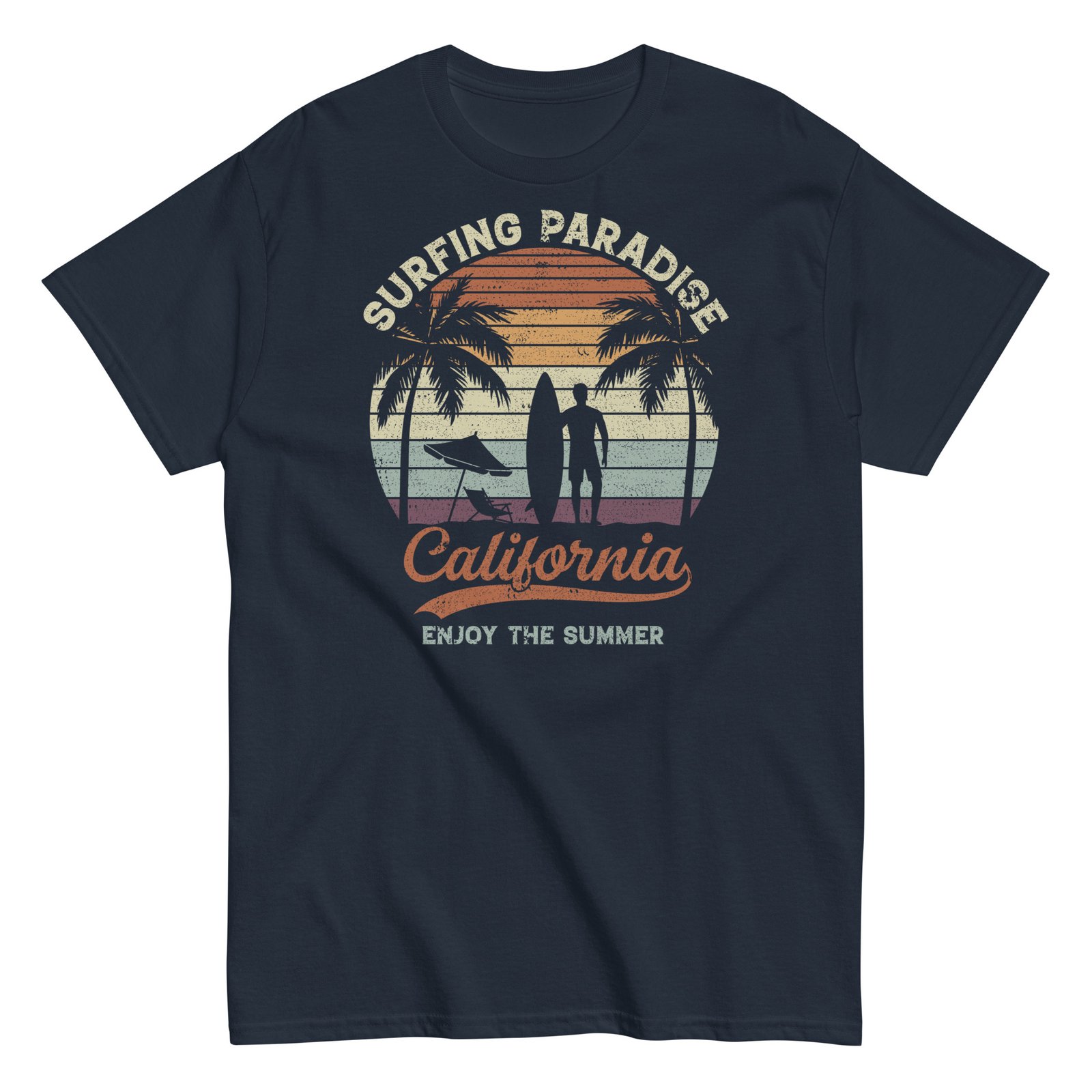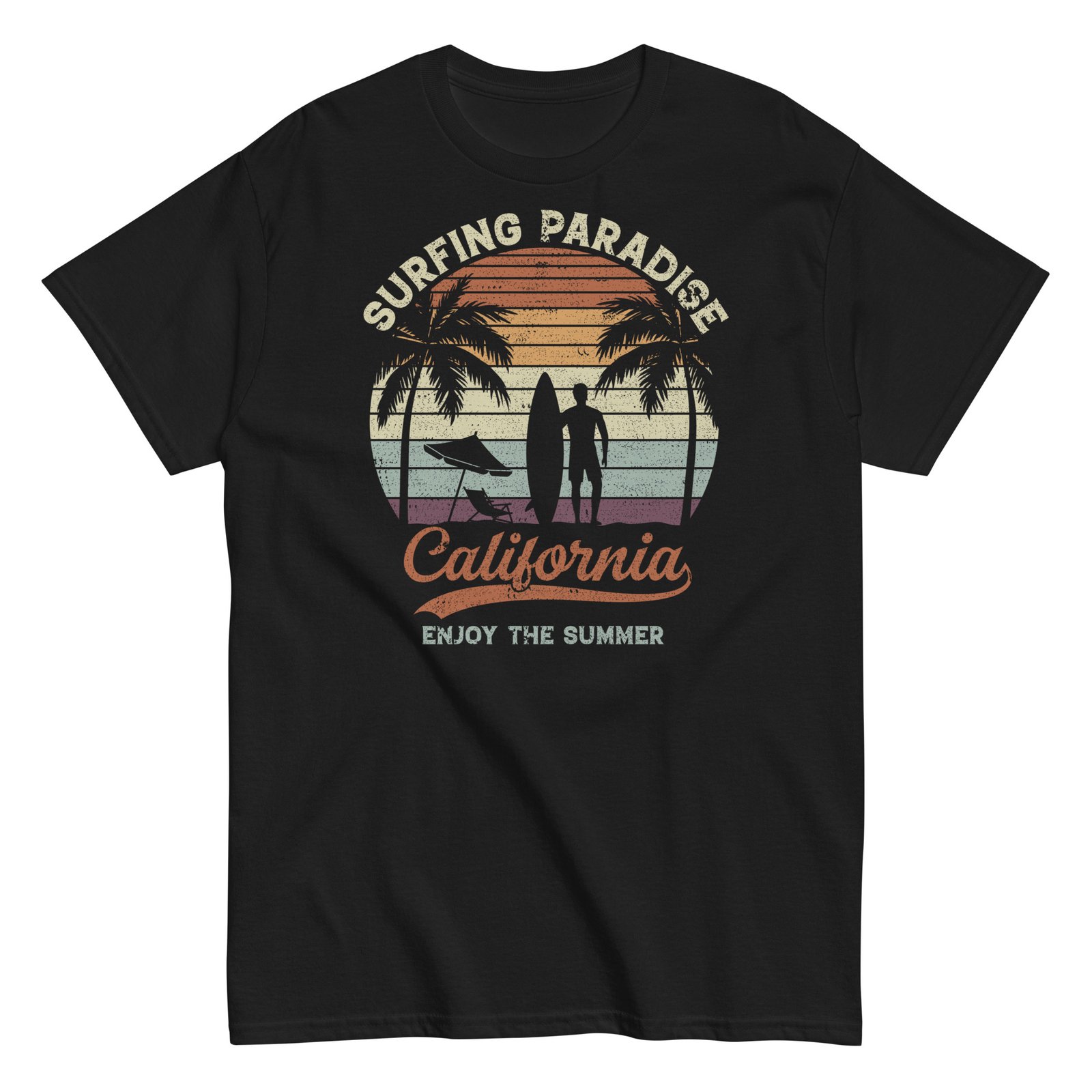Front and centre, you’ll find a surfer silhouette standing proudly with his board, framed by iconic palm trees and a parasol. The background is washed in faded rainbow sunset stripes, giving the whole design a soft, worn-in look that screams retro surf shack. Above, bold text reads “Surfing Paradise California” and below – the laid-back invitation to “Enjoy the Summer”. It’s relaxed, it’s retro, and it’s ready for anything from pub gardens to seaside getaways.