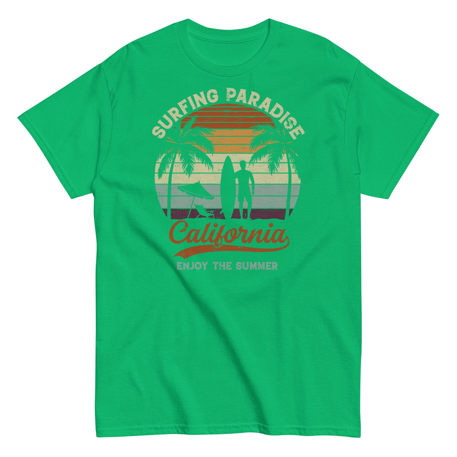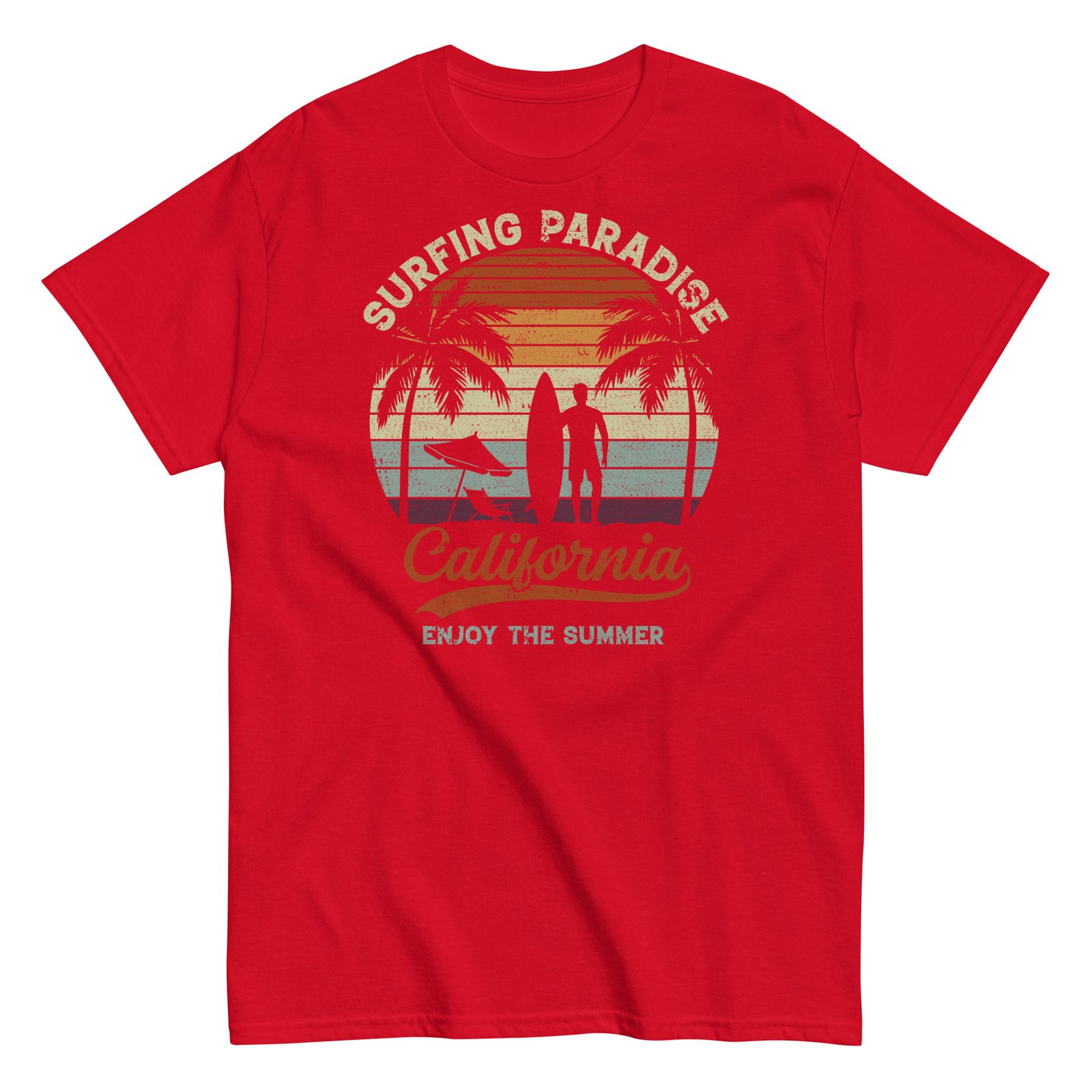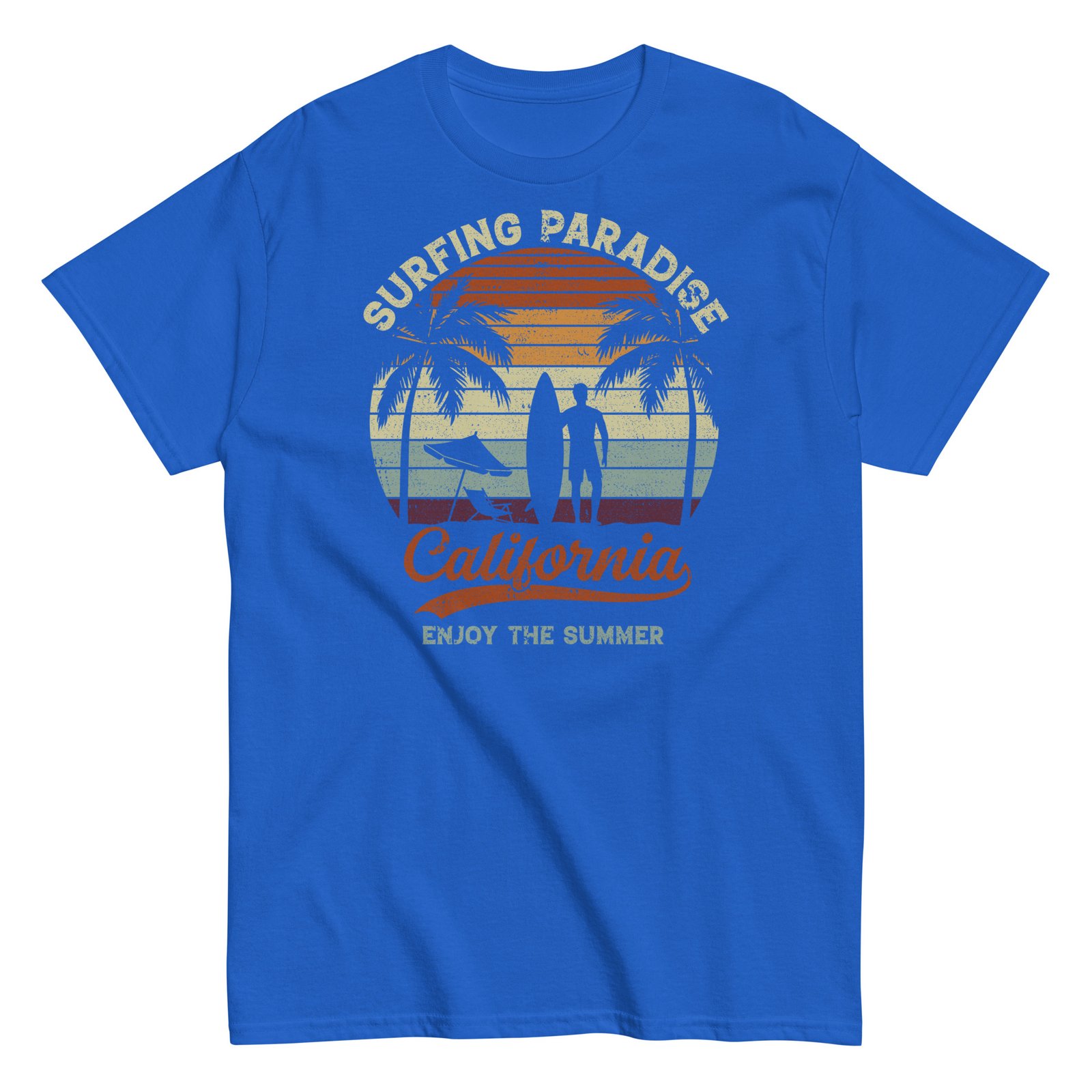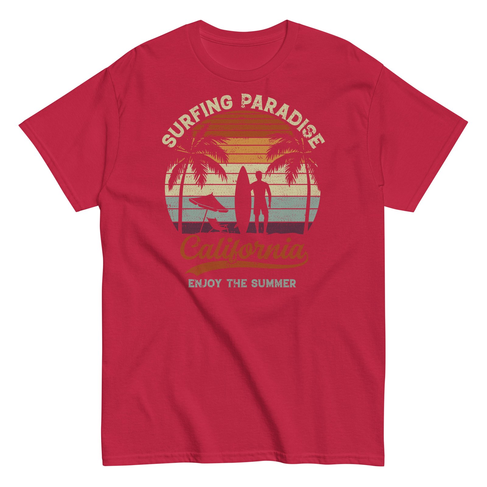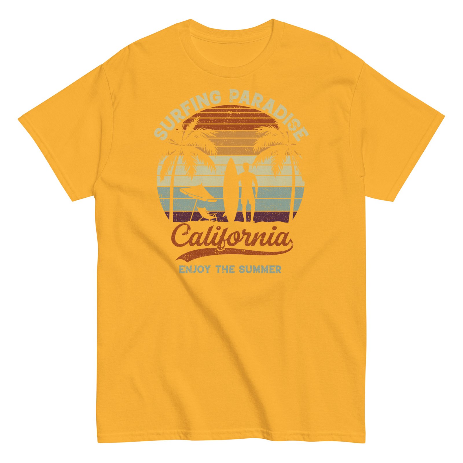 Front and centre, you’ll find a surfer silhouette standing proudly with his board, framed by iconic palm trees and a parasol. The background is washed in faded rainbow sunset stripes, giving the whole design a soft, worn-in look that screams retro surf shack. Above, bold text reads “Surfing Paradise California” and below – the laid-back invitation to “Enjoy the Summer”. It’s relaxed, it’s retro, and it’s ready for anything from pub gardens to seaside getaways.