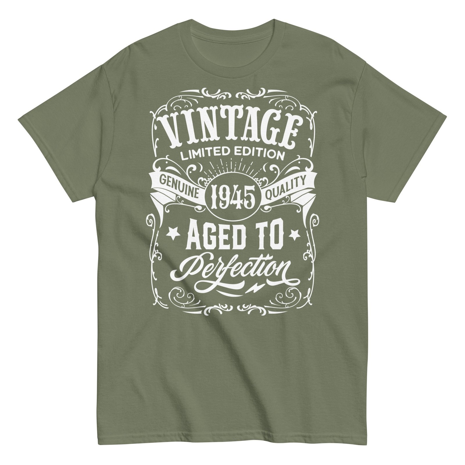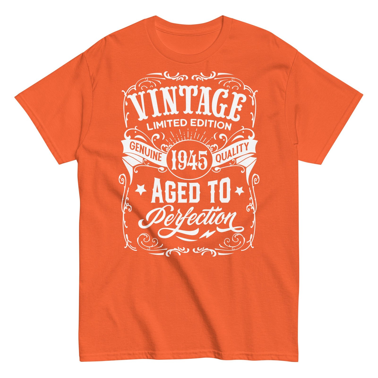 The “Vintage 1945 Aged To Perfection” message highlights the significance of a year filled with memories and achievements. With its timeless vintage style, this T-shirt is perfect for everyday wear or as a statement piece at gatherings and celebrations. The bold design ensures it stands out, making it a conversation starter and a cherished keepsake.