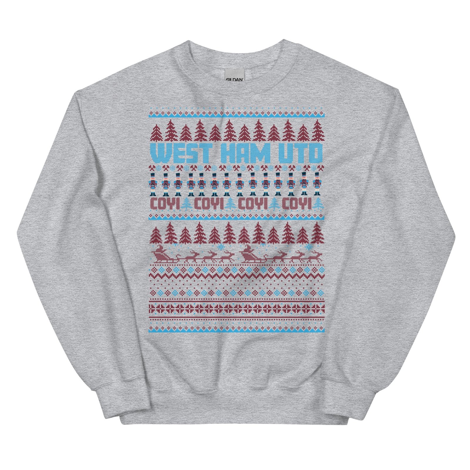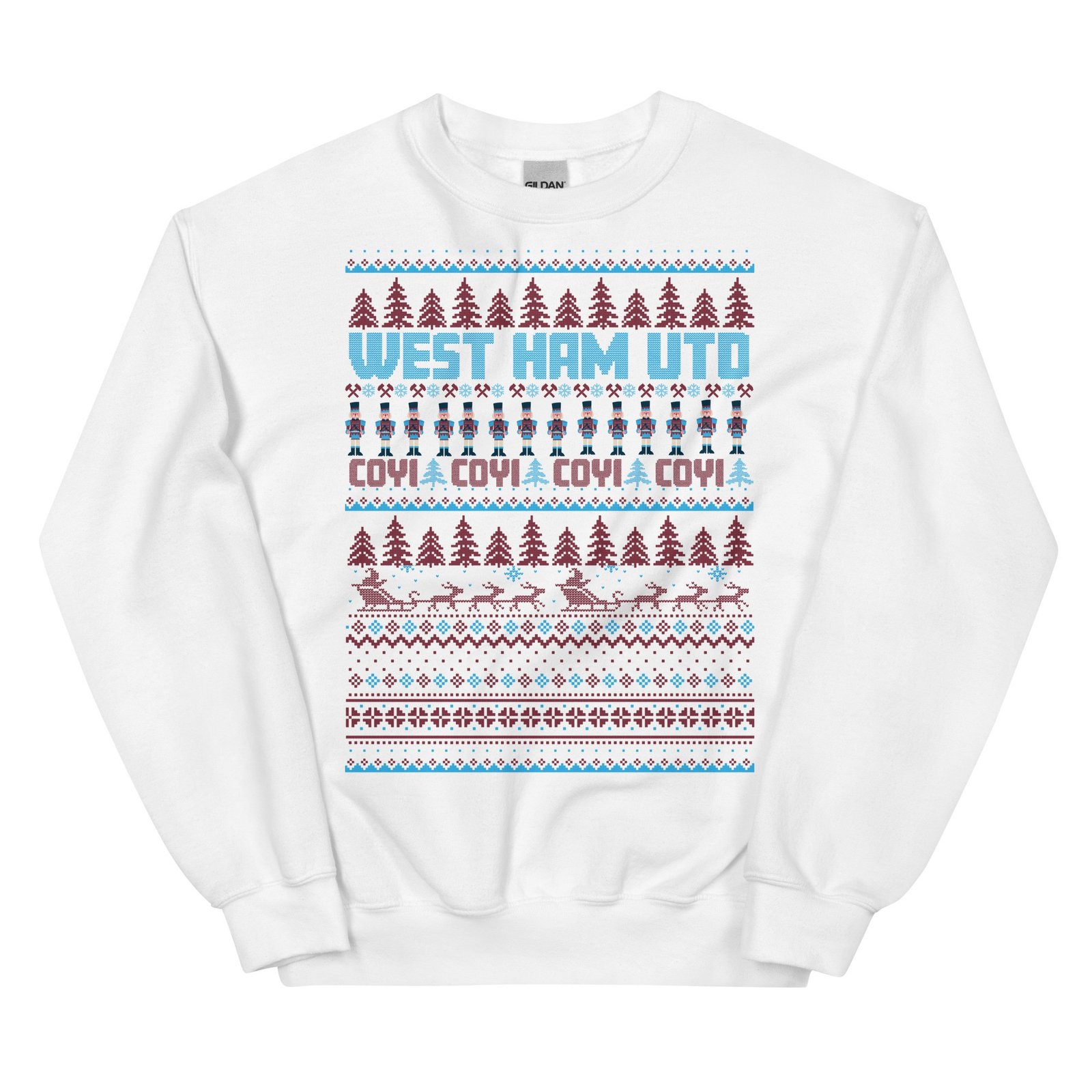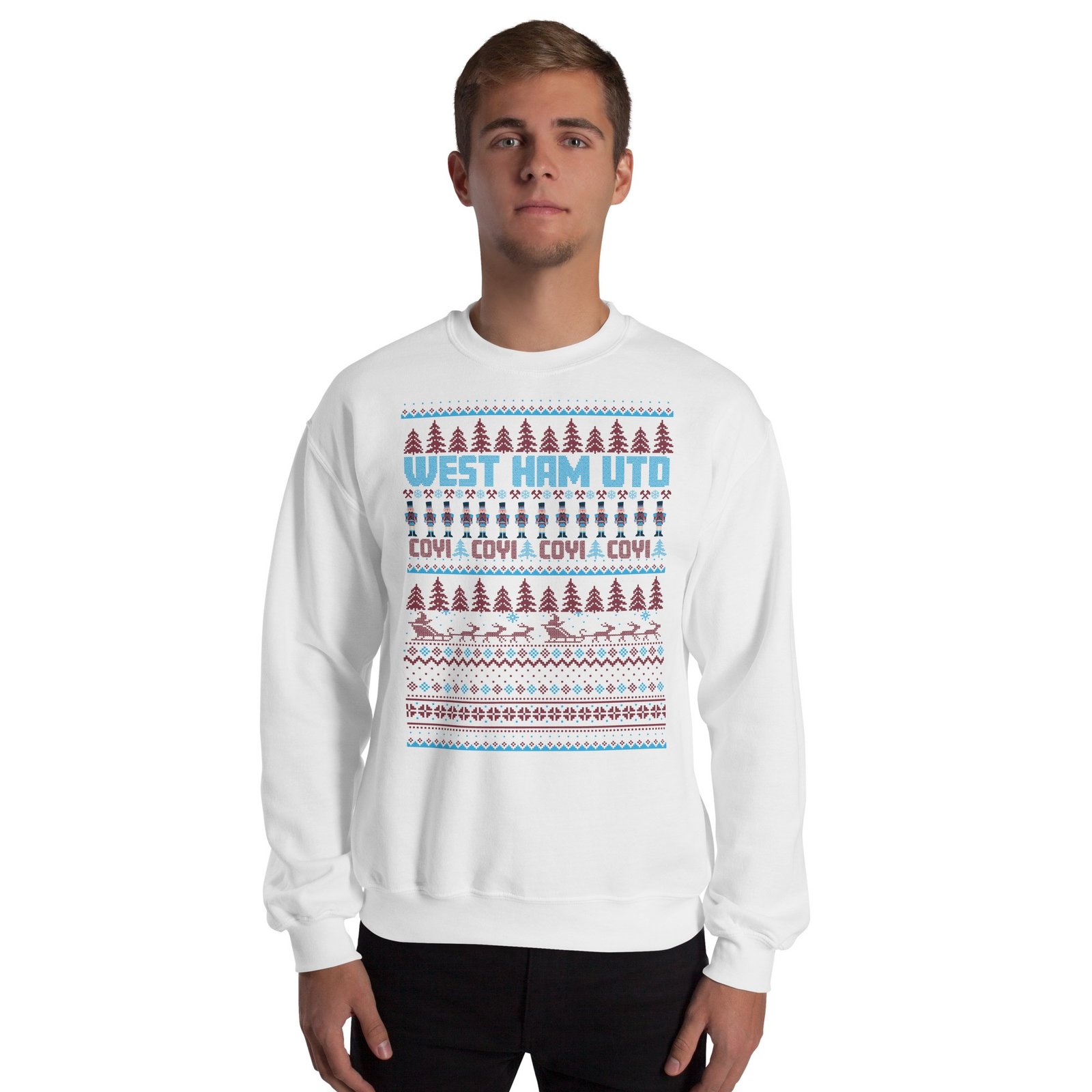 The West Ham Christmas Jumper is the perfect festive attire for fans of West Ham United, combining classic Christmas charm with the unmistakable Claret & Blue colours. Styled with a traditional Christmas jumper look, this sweatshirt is adorned with all the familiar festive images – snowflakes, Santa, Christmas trees, and nutcrackers – creating a cheerful, seasonally inspired design. Boldly featuring the text “WEST HAM UTD” and the fan-favourite “COYI” (Come On You Irons!), this jumper allows Hammers fans to show their pride throughout the Christmas season. Available in various colours and sizes from S to 3XL, it’s a must-have for every true supporter looking to spread a bit of football-inspired cheer.