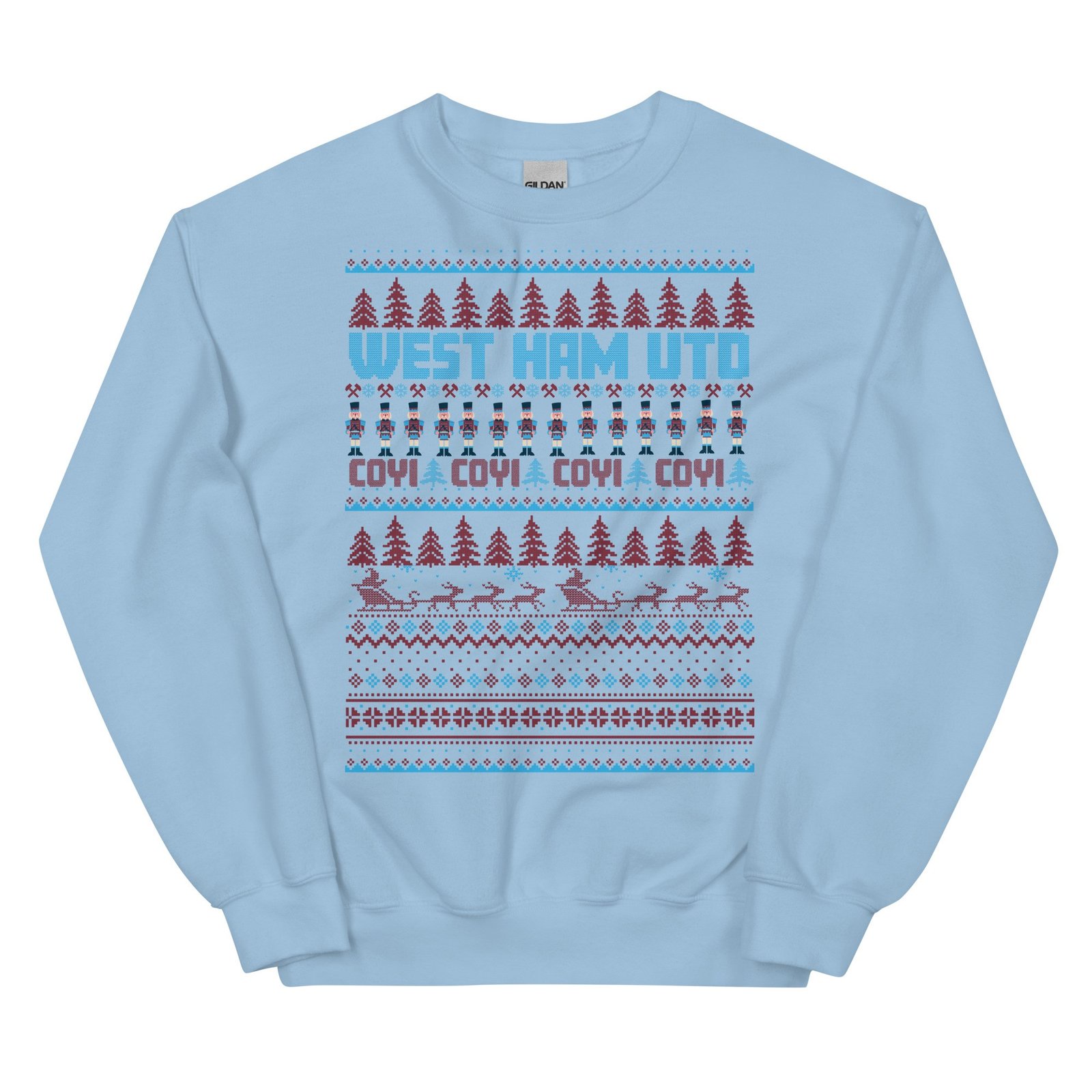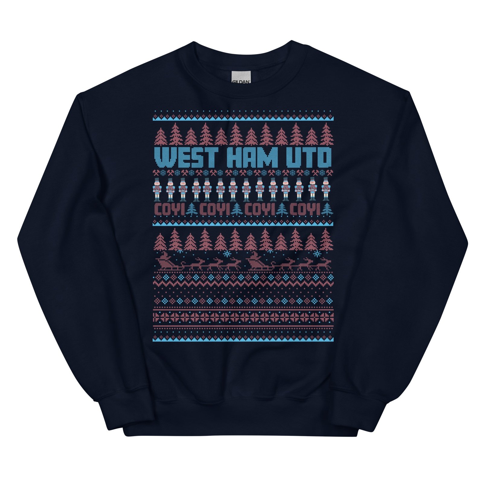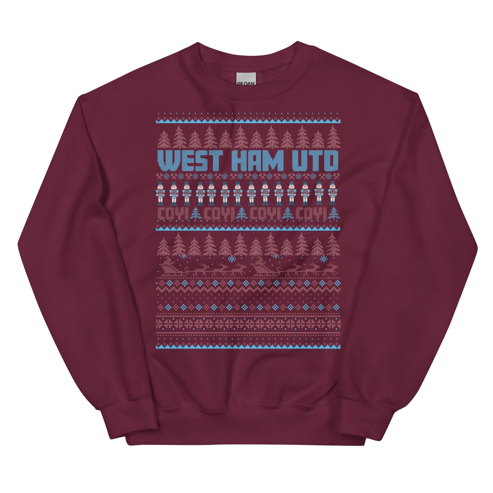 The West Ham Christmas Jumper is the perfect festive attire for fans of West Ham United, combining classic Christmas charm with the unmistakable Claret & Blue colours. Styled with a traditional Christmas jumper look, this sweatshirt is adorned with all the familiar festive images – snowflakes, Santa, Christmas trees, and nutcrackers – creating a cheerful, seasonally inspired design. Boldly featuring the text “WEST HAM UTD” and the fan-favourite “COYI” (Come On You Irons!), this jumper allows Hammers fans to show their pride throughout the Christmas season. Available in various colours and sizes from S to 3XL, it’s a must-have for every true supporter looking to spread a bit of football-inspired cheer.